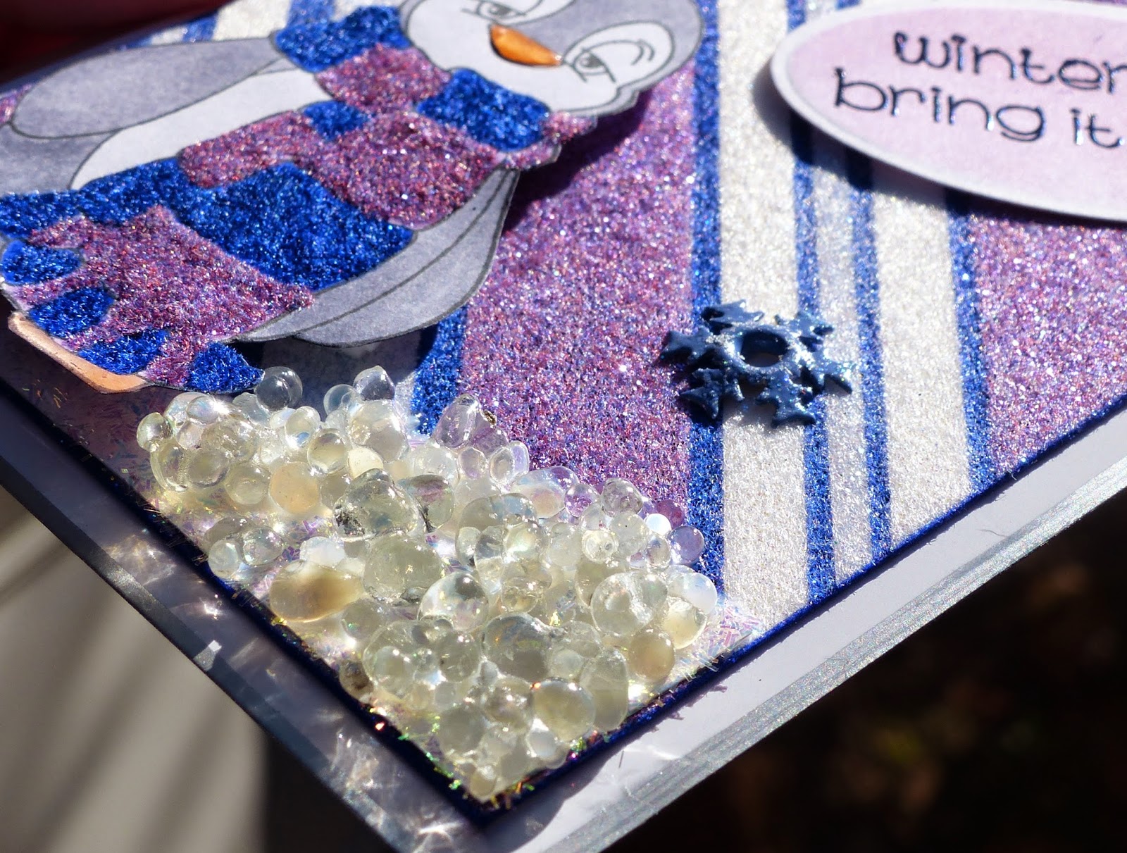 As you can see, I decided to go with the new Big Wet Kisses set and also incorporate the Under the Mistletoe Set 556. Still in Christmas mode I used the Die-Versions Mistletoe die cut to make my seaweed and mistletoe branch. I applied 2 1/2" Tear-ific Tape to white cardstock before die cutting the Mistletoe four times. Then I removed the protective backing and applied the three new opaque Frozen glitters to different stems of the Mistletoe.